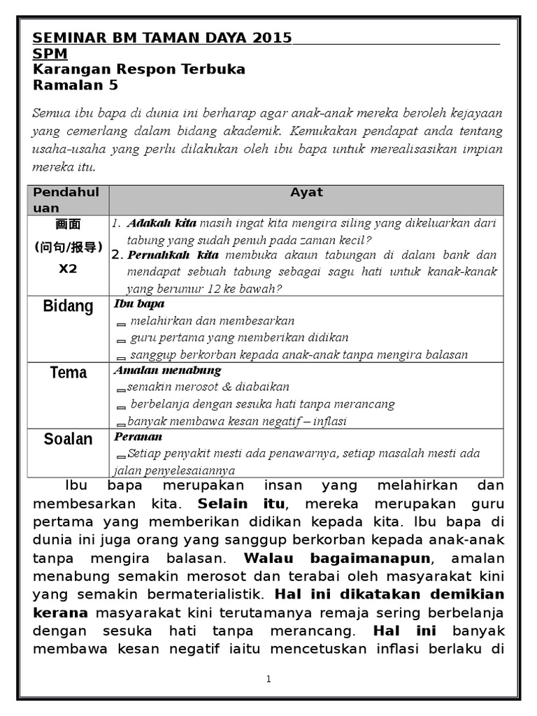 Huraikan peranan ibu bapa dalam memastikan amalan menabung menjadi budaya masyarakat kita. Menabung merupakan tabiat menyimpan wang. Peranan ibu bapa dalam membesarkan anak bermula sebaik sahaja si kecil dilahirkan. Contoh karangan spm (dimensi keluarga). Bidang sukan merupakan salah satu bidang yang penting di negara kita selain bidang pelancongan dan perindustrian. Jika anda masih keliru tentang tanggungjawab sebagai ibu ayah, artikel ini untuk anda. Apakah peranan ibu bapa dalam memastikan amalan menabung menjadi budaya masyarakat kita? Menjalinkan komunikasi yang baik dengan anak; Amalan menabung haruslah dipupuk sejak kecil lagi bak kata pepatah melentur buluh biarlah dari rebungnya. Institusi kekeluargaan adalah antara unit penting dalam kehidupan bermasyarakat. Amalan mulia ini bukan sahaja dapat mengeratkan silaturahim dan menjalin ukhuwah, tetapi juga mampu mengukuhkan semangat kejiranan dalam kalangan masyarakat. Secara definisinya, menabung ialah menyimpan wang atau barang berharga di bank atau di tempat yang selamat. Menjelang era milieu yang sarat dengan informasi dan teknologi, momentum arus terus bergerak ke depan dengan tidak berlengah lengah.